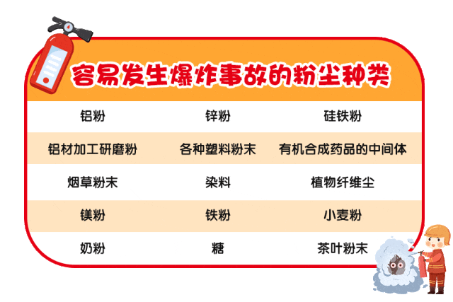 粉尘类型,如面粉、淀粉、奶粉、玉米粉、铝粉、钛粉、锌粉等,都是容易爆炸的粉尘类型,其爆炸温度多达400至600℃。