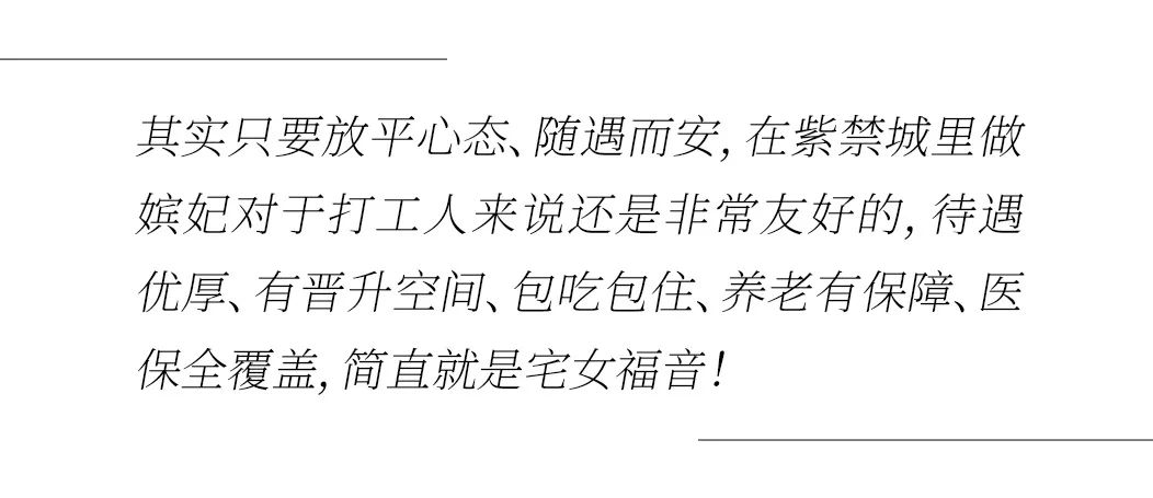 据说一旦进入宫门,就像大海一样深。只要我们冷静下来,随遇而安,在紫禁城做妾对农民工还是很友好的。他们待遇优厚,有晋升空间,管吃管住,养老有保障,医疗保险全覆盖。每天的工作内容都是钓鱼,简直就是宅女的福音!