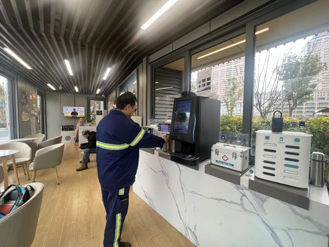 路上的噪音越来越大,突如其来的大雨扰乱了前进的步伐。党群服务站不仅可以避雨,还可以分享雨伞供大家使用。当然,你也可以在离开前带一杯免费咖啡。在通勤的路上,这是农民工的温暖支持。