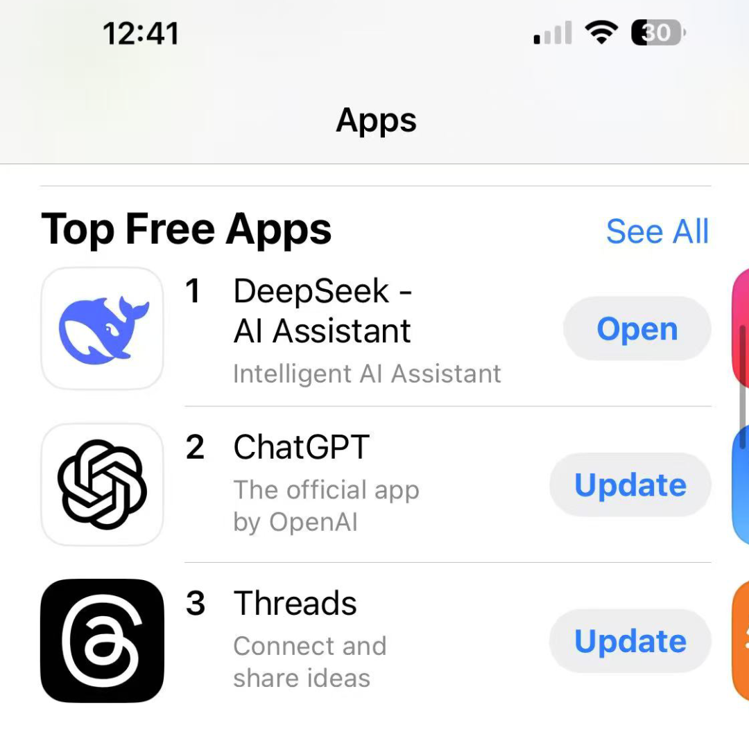 随著DeepSeek热度的不断上升, 历史上第一次有一个APP。 可以同时在苹果中国和美国地区应用程序排在免费APP下载排行榜的第一位,在美区下载排行榜上超越了ChatGPT。由于客户流量的急剧增加,DeepSeekAPP一度出现服务器短暂繁忙甚至“崩溃”的情况。