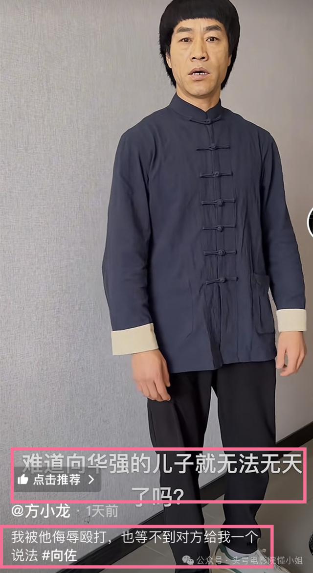 针对这一幕,当事人方小龙,即视频中与向佐接触的李小龙模仿者,迅速在网上公开发声。他发布了一段视频,写道:“我被他侮辱殴打,也等不到对方给我一个说法。 # 向佐“,后面有向佐的标签。