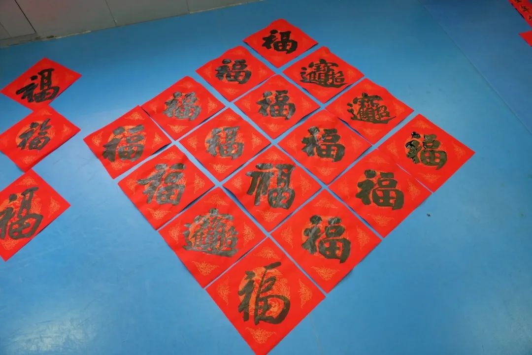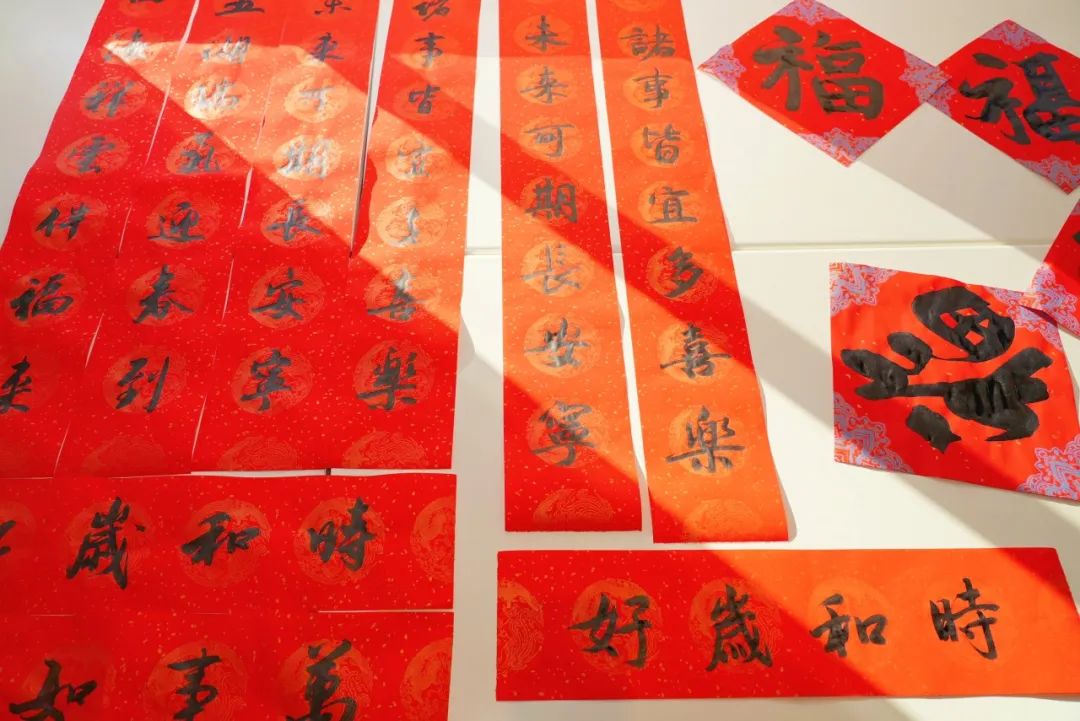 他们有的帮忙拉纸,有的传笔墨,有的晾干春联和祝福,捧着专属的“定制”祝福和春联。喜悦溢于言表,每一个场景都弥漫着浓浓的年味。