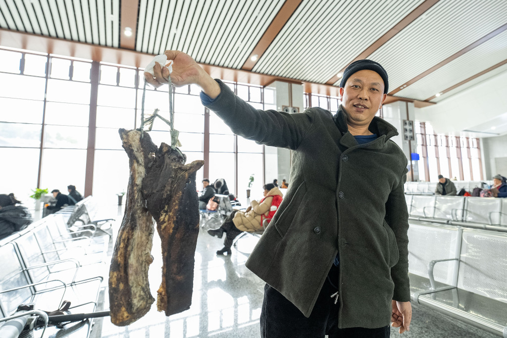 2025年1月25日,贵州毕节,乘客们在成贵高铁毕节站候车大厅回云南过年。他在行李箱里展示带回家的腊肉,表示家人最喜欢毕节生产的原生态腊肉味道。视觉中国 图