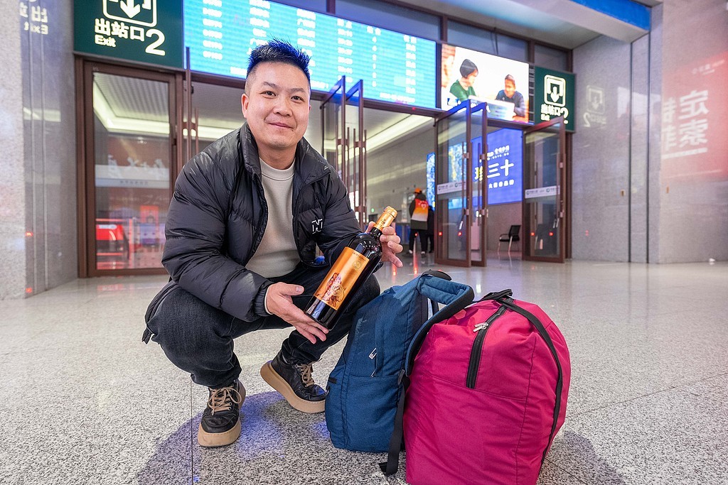 2025年1月25日,贵州毕节,乘客黄建永在成贵高铁毕节站出口展示从杭州带来的红酒,为父母准备饮用,希望父母身体健康。