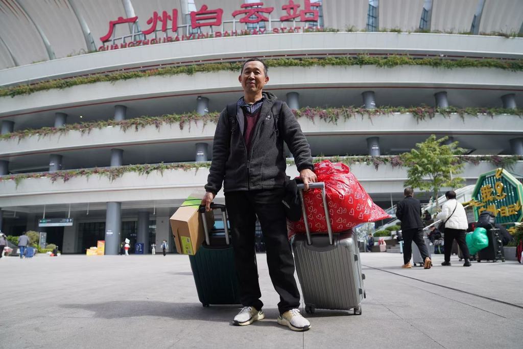 59岁的刘光辉于2025年1月14日来自河南信阳,他在广州一所大学的食堂当厨师。虽然刘光辉只能买站票,但他给父母买的礼物很早就准备好了:他左手拉的行李箱上的包裹是给他妈妈买的被子,另一边行李箱上挂的纸箱是给他爸爸的鞋子。乐观的刘光辉觉得自己属于“能奋斗的60后”,孩子的发展也有了定位。他只是想在广州工作几年,“为广州的发展贡献一点微薄的力量”。