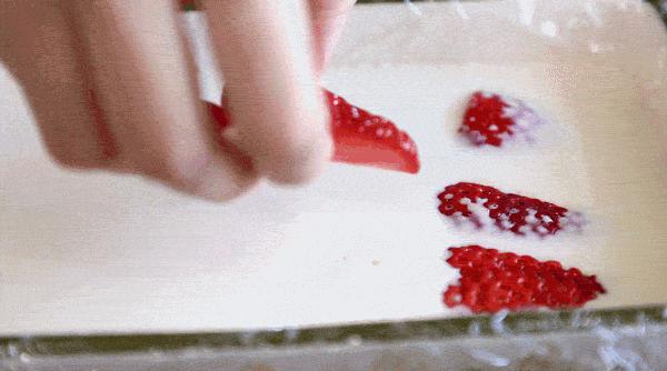 5. 把切好的草莓放进去,不用担心会掉下来,会浮起来。然后放在冰箱里冷藏一晚上,白天的话 3 大约一个小时,等待凝结时可食用。