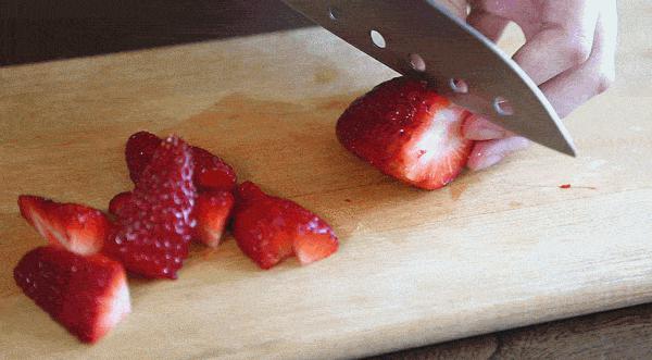 2. 洗净草莓,切掉草莓蒂,切成草莓。 4 这一点可以根据个人爱好来做,一分为二也可以。
