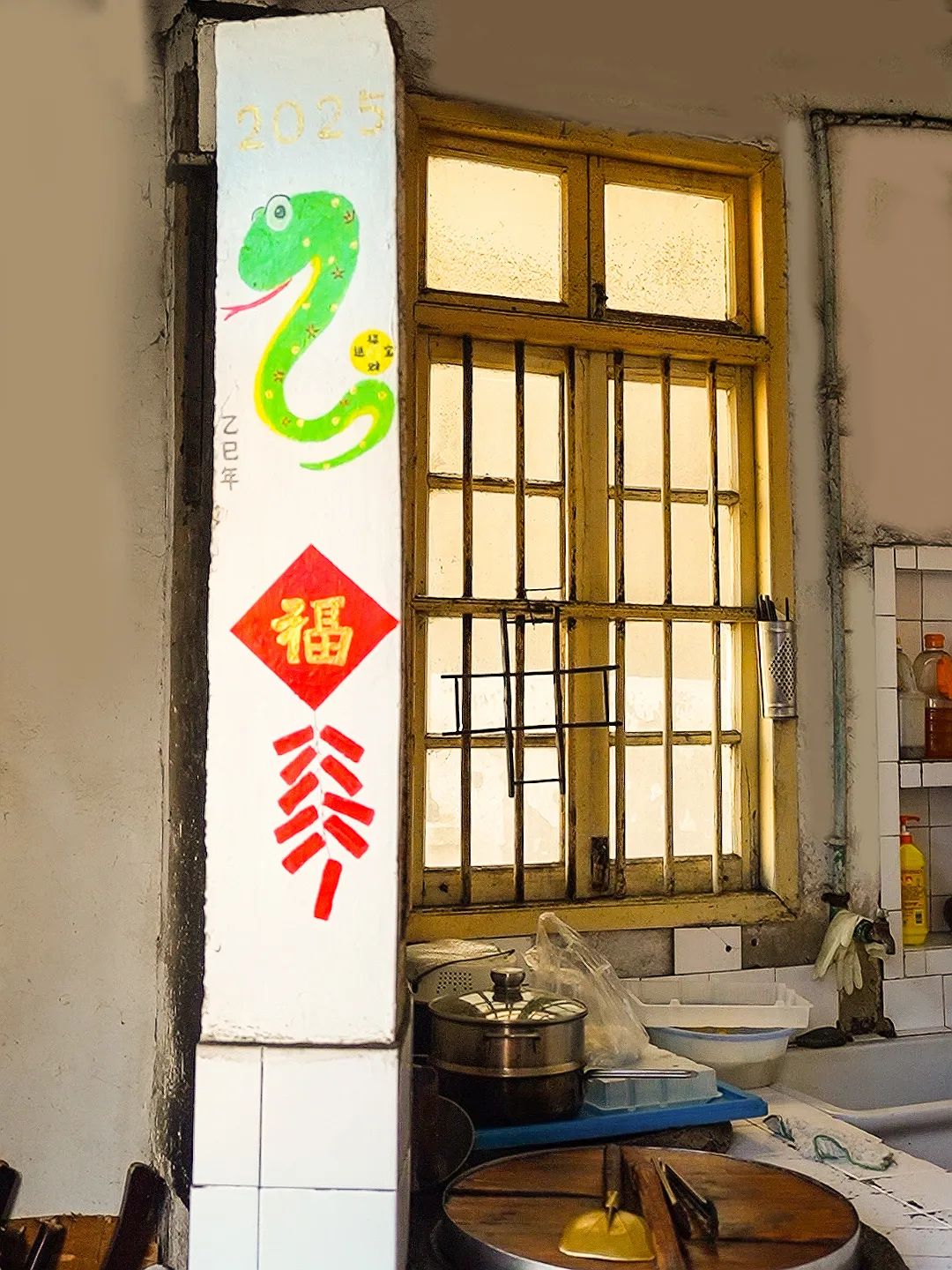 走进敏感的家,一眼就能看到炉子上刚刚完成的炉画。五颜六色、生动形象的小青蛇回旋而上,身上镶嵌着祥云和铜币,充满活力和活力。金色的“福”字跃然其上,传递着满满的新年祝福。“福”字下的鞭炮交织在一起,意思是财源滚滚,喜事连连。