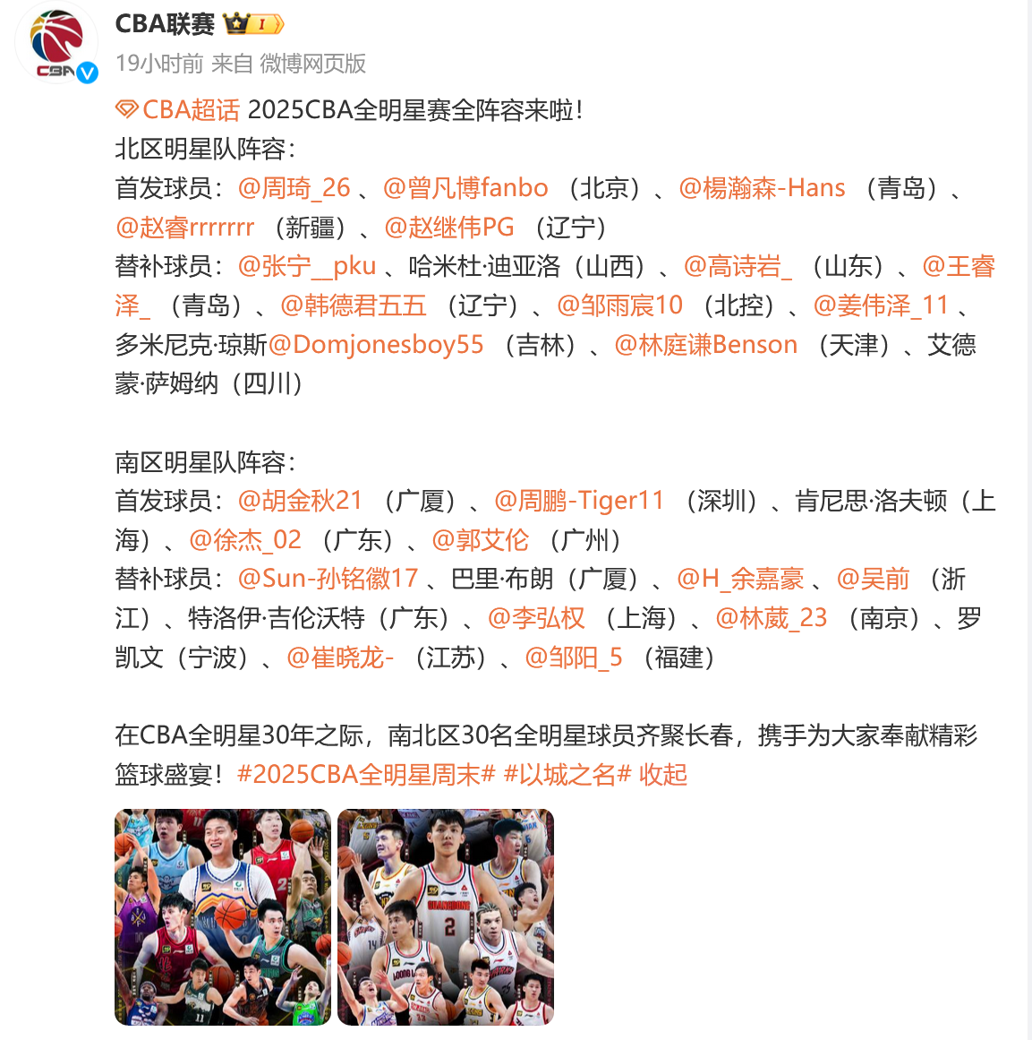 CBA公布了全明星名单。