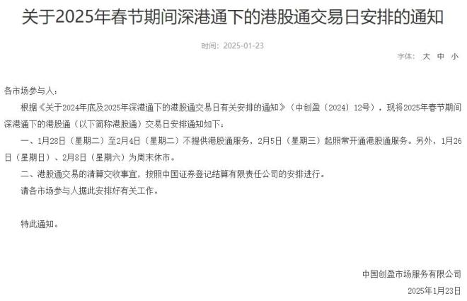 港股通方面,沪深交易所明确表示,港股通服务将于1月28日(星期二)至2月4日(星期二)不提供,港股通服务将于2月5日(星期三)照常开通。此外,1月26日(星期日)、二月八日(星期六)是周末休盘。