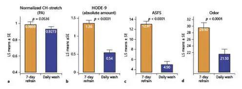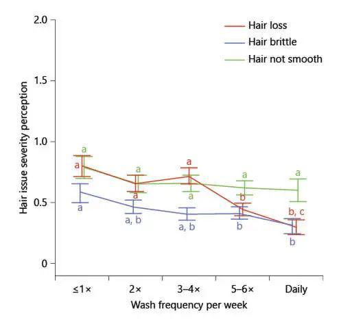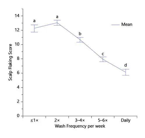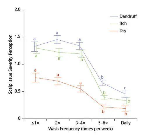 随著洗头频率的增加,头皮屑、瘙痒和自我感知干燥的严重程度显著降低
