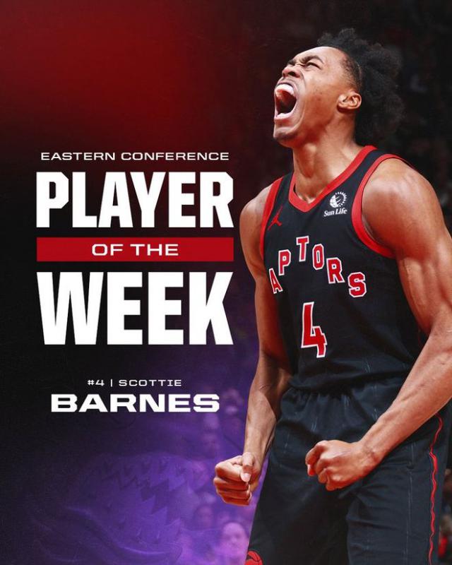 上星期,猛龙得到了 3 胜 0 负面记录,巴恩斯平均场均 22 分 9.7 篮板 6 助攻。猛龙官方晒出海报,祝贺巴恩斯获奖。