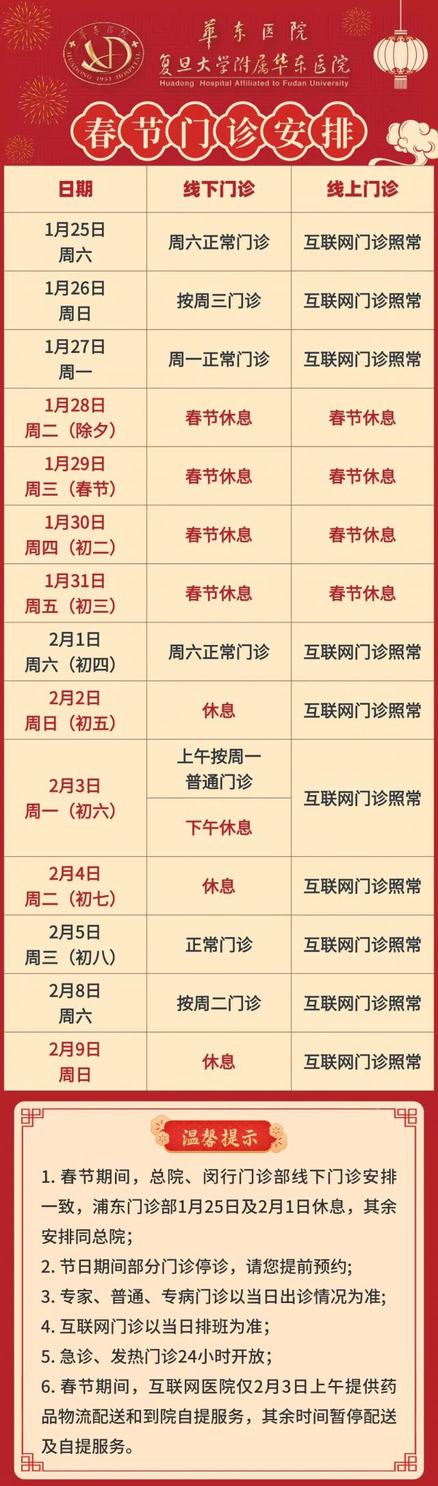 2025 2008年春节期间,复旦大学附属华山医院线下门诊工作时间安排如下,互联网医院 24 小时运行。