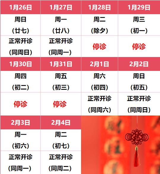 1 月 28 日(除夕)到 1 月 31 第三天(第三天),门诊停诊。