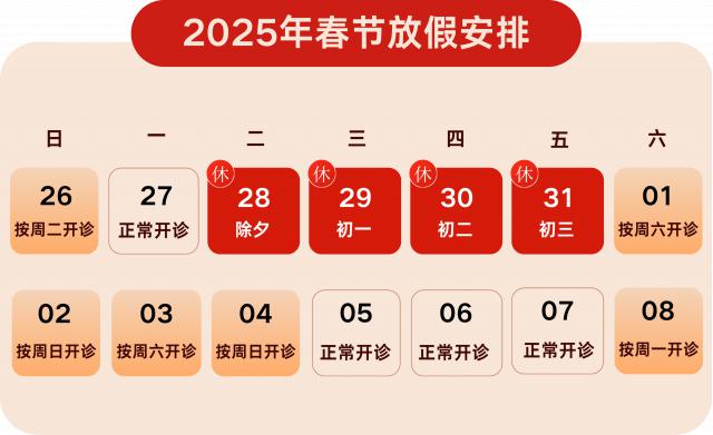 体检中心:1 月 28 日— 2 月 4 日(从除夕到初七)休息;2 月 5 日起照常上班。