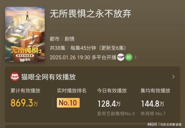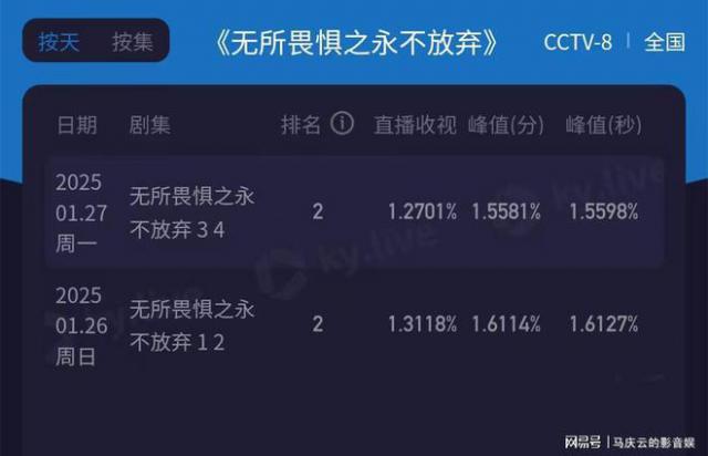 1 月 28 日,酷云给电视连续剧《无所畏惧》 收视率数据持续两天。该剧第一天,收视率 第二天,1.3118%迅速下降至1.3118%。 1.2701%。在过去上星播出的电视剧中,这种下降是罕见的。