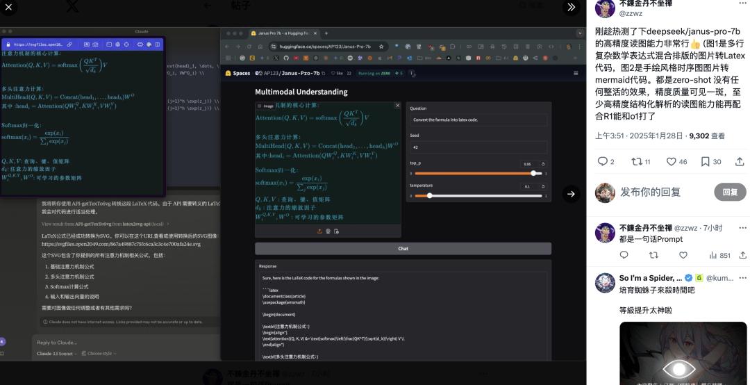 可以看到,在高精度读图上,Janus Pro 还做得很好。能识别数学表达式和文字的混合排版。将来组合推理模型的使用,可能会有更大的意义。