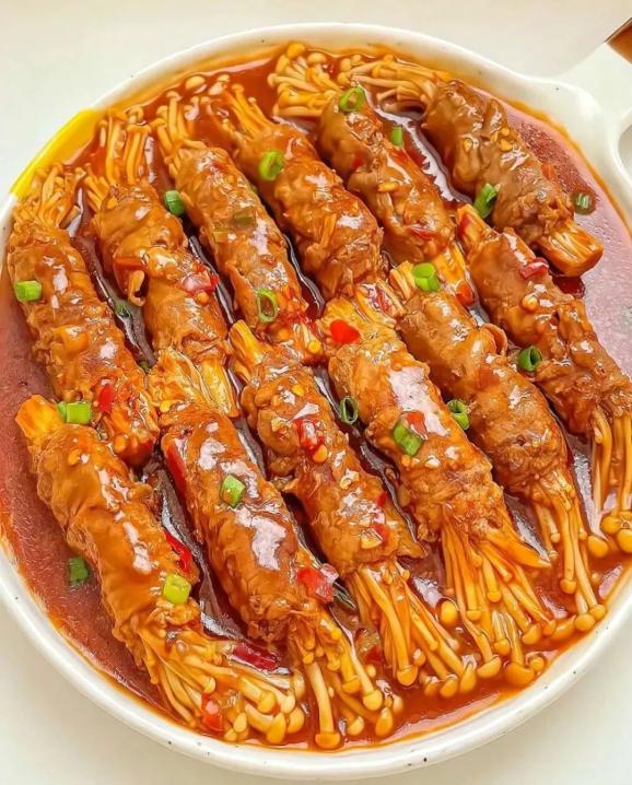 将金针菇处理好,放入肥牛卷中。调整碗汁,2勺酱油,1勺酱油,1勺油耗,2勺糖,半碗水,搅拌均匀。