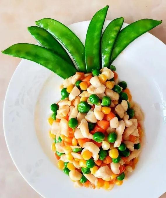 4.选择一个椭圆形的碗,将炒好的菜放入碗中,拧紧,倒入盘中,然后用勺子轻轻整理成菠萝形状。修剪荷兰豆的底部,依次放置成菠萝叶的形状。