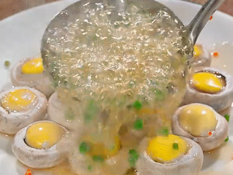 白蘑菇洗净,去蒂,放入盘中。在每一口蘑菇里放一个鹌鹑蛋,不要吃蛋清。