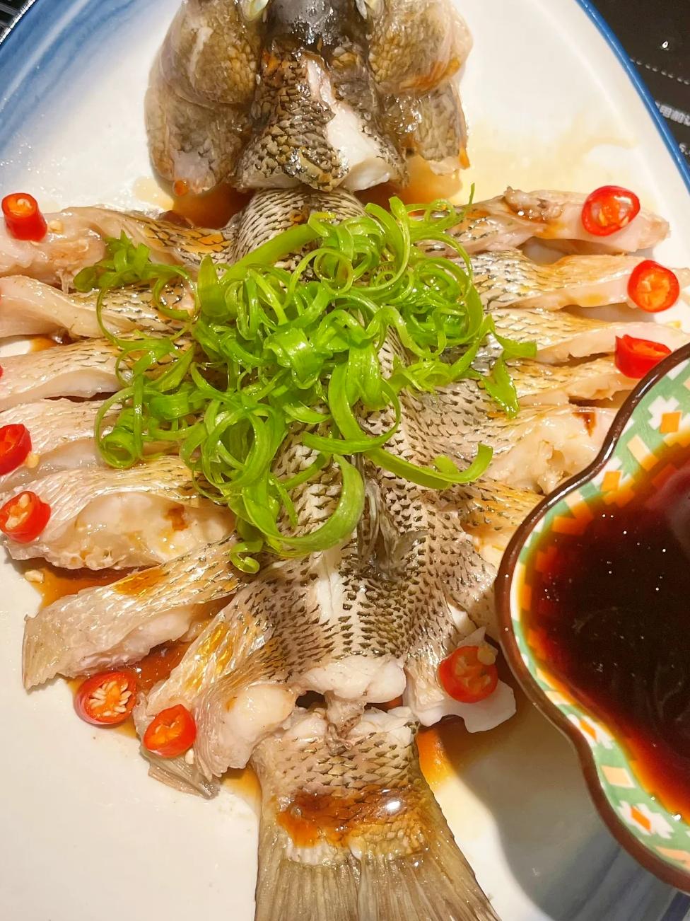 鱼蒸好后,倒出汤汁,放上葱丝、辣椒丝,倒上白烫汁,提鲜增鲜,最后倒上滚油香。