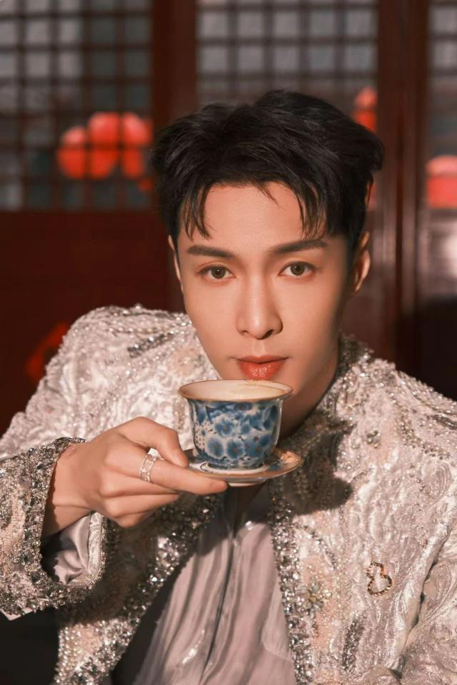 红色小生丁禹兮身穿夏姿陈姿。 SHIATZYCHEN 特别定制的中式服装,首次亮相央视春晚,全身重工钉珠设计,珠光宝气。