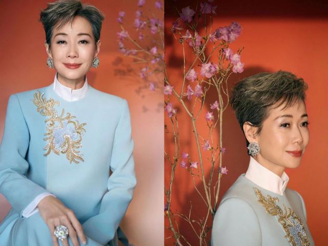 近几年春节档可以看到的喜剧女王马丽,一改往日大大咧咧的样子,各自穿着。 Self-Portrait 闪耀长裙和 Ralph Lauren 浅驼色西服,气质优雅。