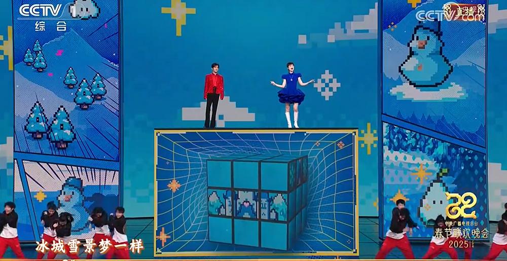 2025年春晚主舞台与观众台相结合,形成“如意”造型。舞台中央5米×与裸眼3D相结合的5米LED正方体升降模块、超高清晰度的视觉投影和XR技术,可以快速转换背景,从细节上恢复古建筑,营造良好的观感。