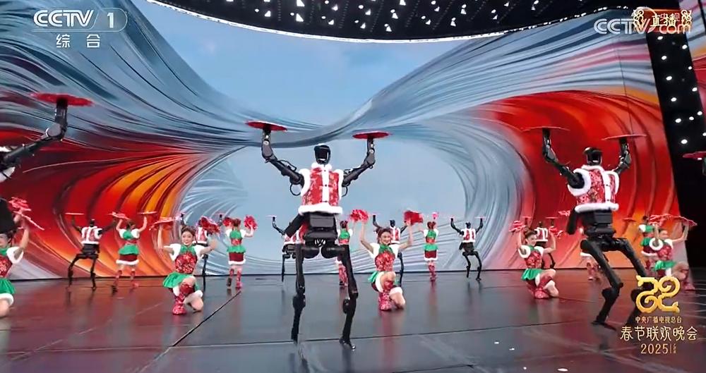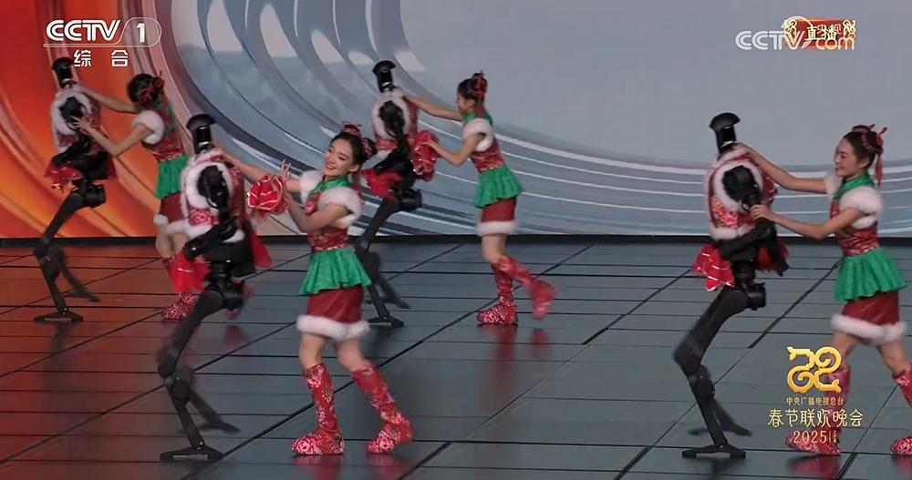 在节目中,穿着红色大花袄的机器人可以改变队形,舞动身体,也可以从多个角度转动手帕。
