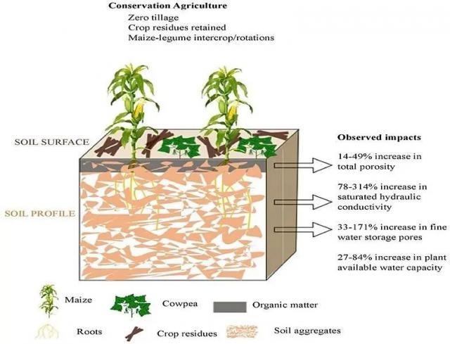 保护性耕作示意图,玉米及豇豆套种,并用秸秆铺在地面上保护,增加土壤多孔性和持水性。 Ogwu94 / wikimedia