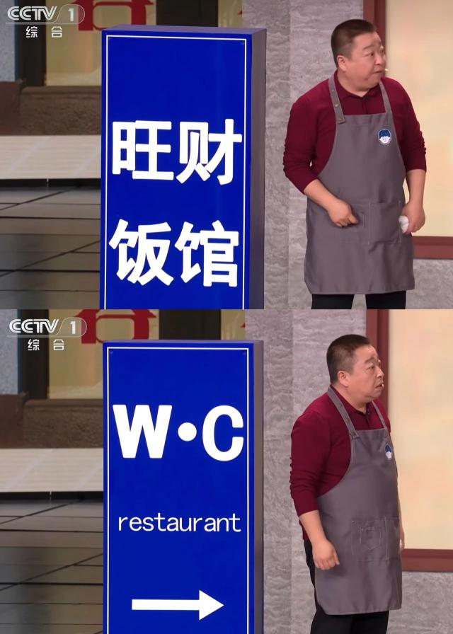 小品也安排了很多类似的例子,造就了很多笑话。比如餐厅规定要加英文名,所以老板要把“富贵”改成“ WC(厕所)";镇长蹲在灯箱前打卡时,说要“吃个‘便’饭”;镇长吃完方便面付款给老板。 40 块,老板却说:“找你 300 "...这些台词可以让人会心一笑。