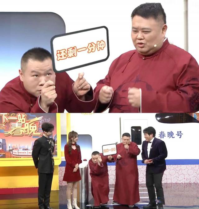 相声才说到一半,结果在舞台上表演的岳云鹏和孙越看到台下的工作人员提醒他们只剩下一分钟了。