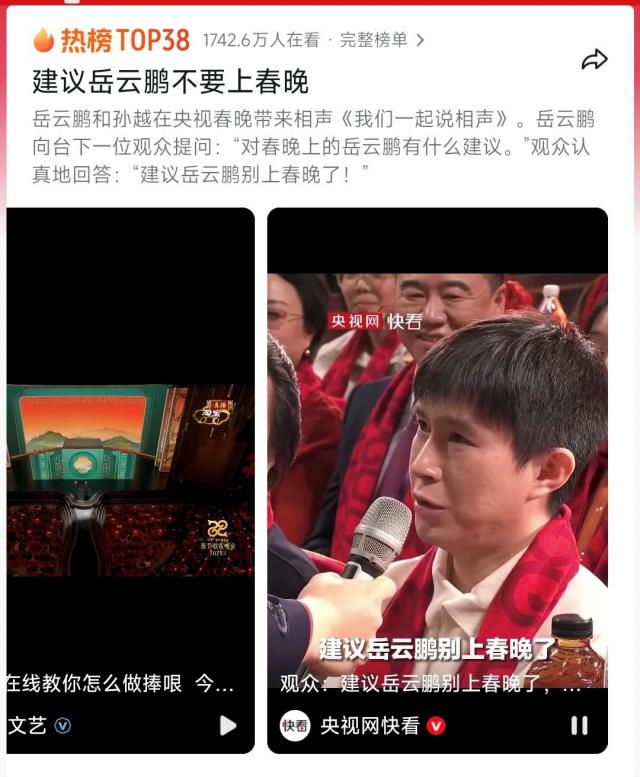 2025 央视春晚岳云鹏和孙越表演的相声节目《让我们一起谈论相声》结束后,“建议岳云鹏不要去春晚”登上了各大社交平台的热搜榜。