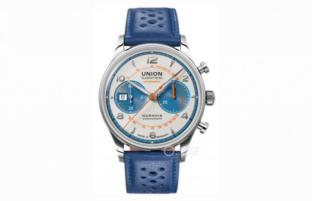手表评价:或许这个诺拉敏斯系列系列可能是这个 2024 年度萨克森古董车拉力赛限量版计时表(型号:D012.427.16.017.09)在本期“彩盘”主题上略有不同,毕竟白色仍然占据了大部分盘面,但令人感慨的是,配色真的太美了,太清新了!蓝色和橙色的配色就是由于 Gulf Oil(海湾石油)的经典配色,是60年代和70年代海湾石油涂装跑车在赛场上封神的专属记忆,绝对是古董粉丝的“爷青回忆”。42 表径毫米,表盘表面设有浅蓝色轨道刻度圈,表盘中央设有橙色测速仪。整体复古元素优秀,功能突出,但不凌乱。在中间放置橙色测速仪,与两个蓝色副盘重叠,也更突出了海湾石油的经典配色,更具吸引力和活力。内部搭载 UNG-27.S2 自动化机械机芯,配有硅游丝,还升级为无卡重量微调摆陀,满链条条件下有硅游丝, 65 小时动储能力,综合性能非常强。