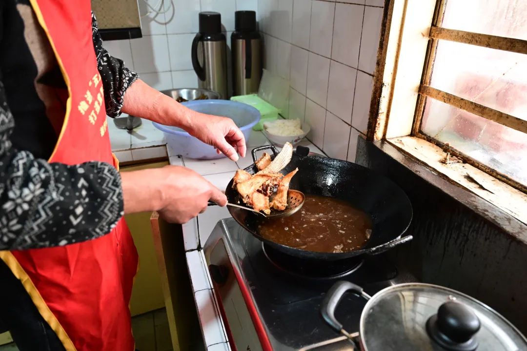 在等待鱼丸煮熟的同时,辛维兴又捡起了爆炸性的鱼。我看到他把鱼丸剩下的部分切成块,用黄酒、胡椒粉等调味品腌制,然后依次放入热油锅中。“做爆鱼最重要的是高油温。”辛维兴说,鱼必须在油九成热的时候放入锅中,这样鱼才能瞬间收紧,不容易散开。