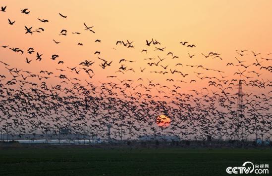 2025 年 1 月 27 日本,安徽省安庆宿松县农垦华阳河农场,成千上万只大雁时而在天空中飞翔,时而在田园里嬉戏,宛如万鸟迎春的生态画轴。