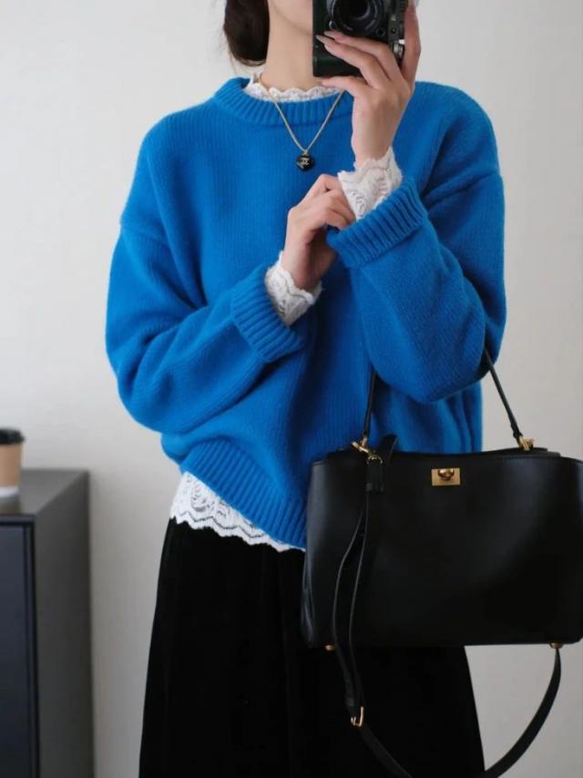 我宣布,这套就是叠穿界的扛把子!与玫瑰蕾丝衫搭配的克莱因蓝毛衣,让我心旷神怡。