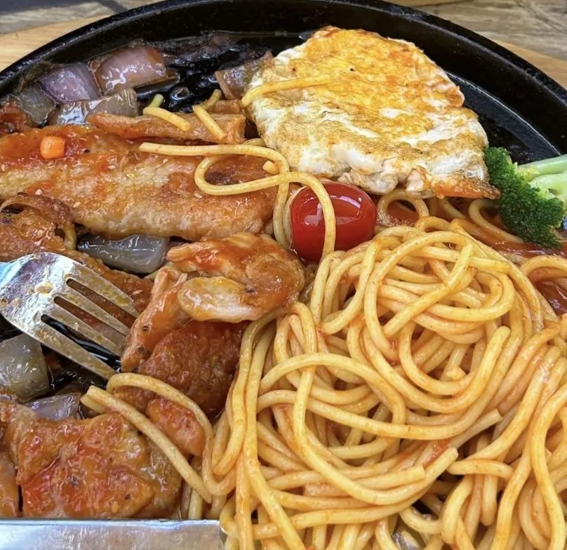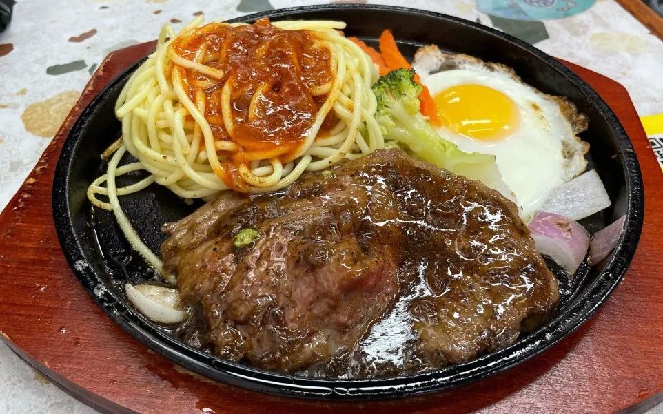 炒好的牛排和鸡蛋搭配浓浓的面条,用水果和蔬菜装饰,好吃又优雅。拿着刀叉的那一刻,我仿佛离开了喧闹的街角,置身于西餐厅。牛排被油覆盖,吸引着食客品尝。当面条和牛排在嘴里遇到水果和蔬菜时,是一种多么美妙的感觉啊!