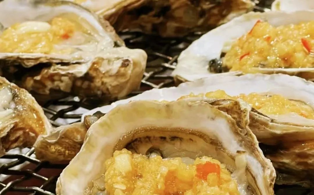 这是烤牡蛎的声音。你听到了吗?冬天温暖的碳火静静燃烧,肥牡蛎躺在壳里,甜汁在高温下流淌,蒜末和粉丝在这温暖的包裹下逐渐变色。香喷喷的烤牡蛎,每一口都充满了幸福。
