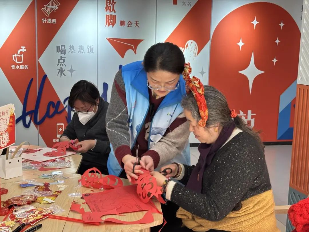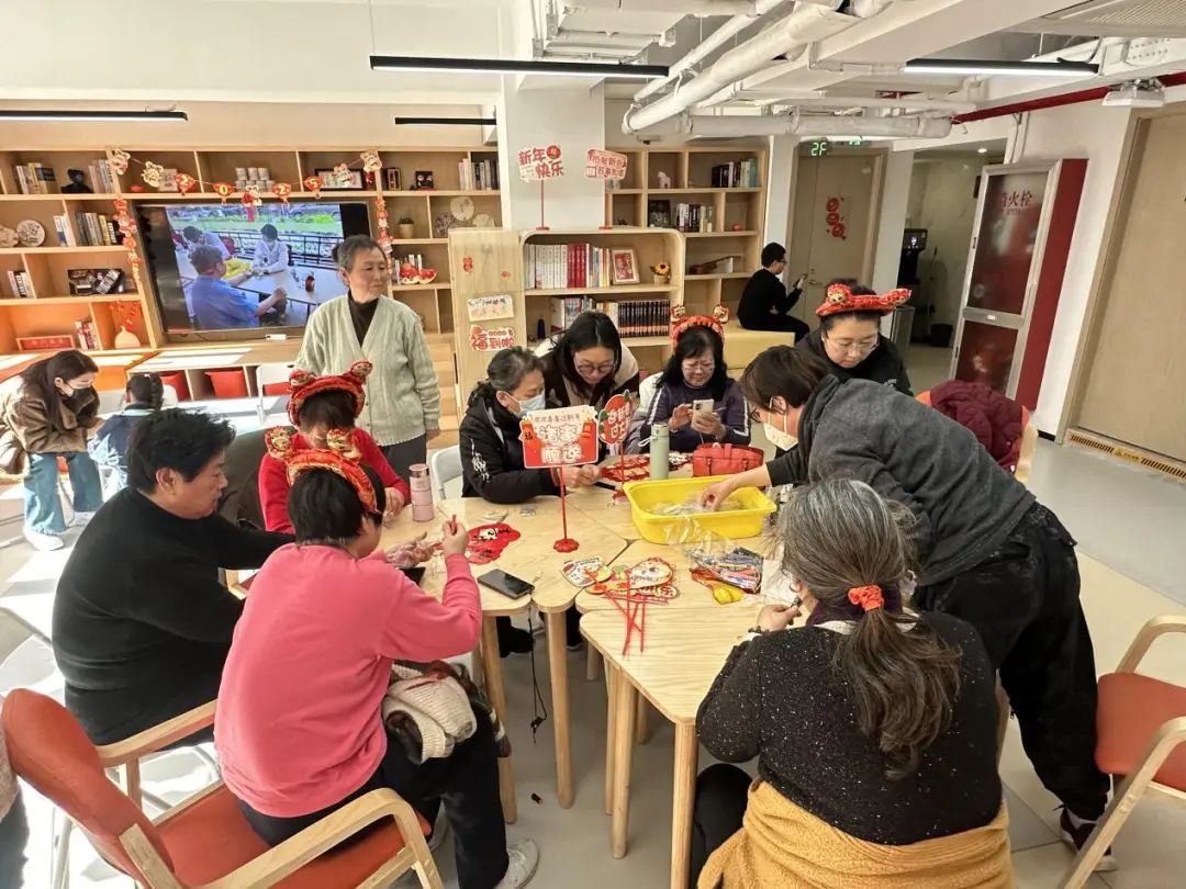 一月十六日,虹口区市民驿站四川北路街道第二分站制作祈福钥匙扣、新年窗花、新年贺卡创意DIY。