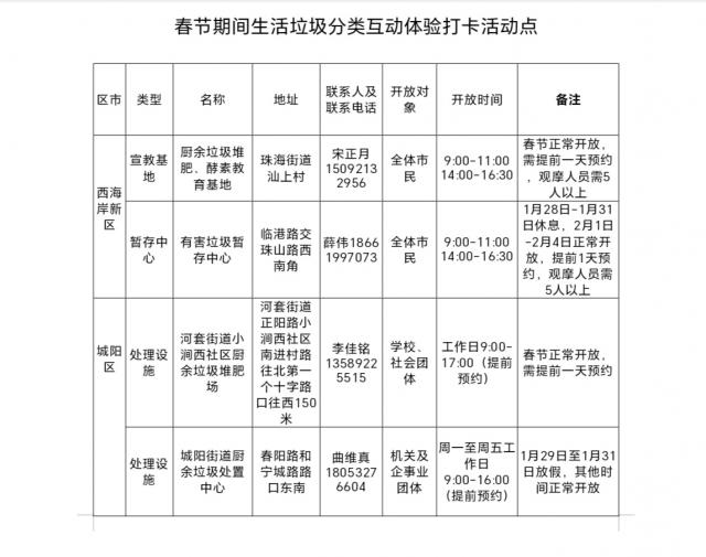 记者从青岛市城市管理局了解到,目前青岛共有全市。 56 处理垃圾分类处理互动体验打卡活动点,免费向公众开放体验。2025 年 1 月 28 日 -2 月 4 春节假期期间,全市都有 13 处理垃圾分类处理互动体验打卡活动点正常向公众开放。春节假期期间,其它垃圾分类处理互动体验打卡点暂停开放,请市民提前计划感受参观计划,防止跑空。