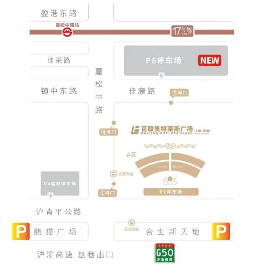 P1(1号门)包括百联奥特莱斯商圈停车场、P4(沪青平/嘉松路口西边)、P6(佳康路北侧)、合生新天地停车场,熊猫广场停车场等。