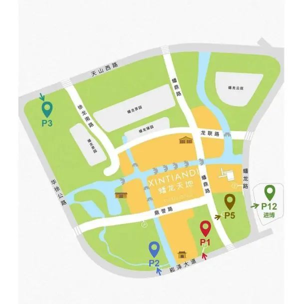 盘龙天地停车场包括内部P1、P2、P3、P5停车场和进博P12(盘龙路)停车场。