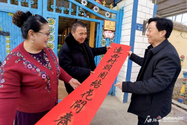 1 月 28 日本,尉犁县兴平镇达西村石榴巷,村民周金山(右一)给吐尔逊 · 司马衣夫妇解释了春联的美好含义。石榴云 / 新疆日报记者 杜建辉摄