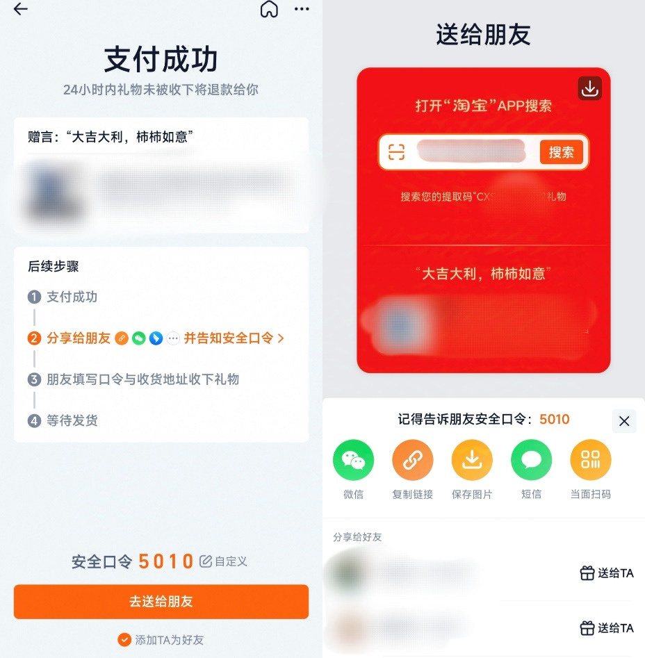 只要淘宝用户搜索相应的产品,就可以在产品页面位置看到“送给朋友”的入口。付款完成后,会生成安全密码,用户可以直接发给朋友。虽然也可以分享到微信,但目前淘宝的送礼功能只能通过复制链接分享给微信朋友,受赠人需要输入安全密码才能获得。
