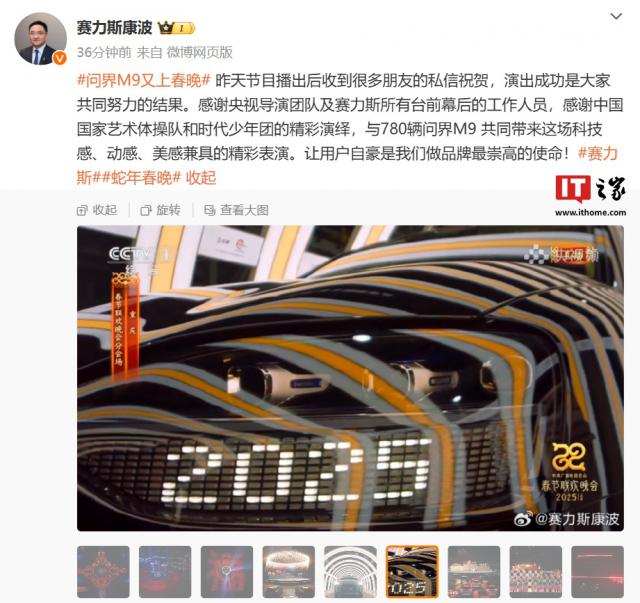 赛力斯康波:780 辆问界 M9 汽车参加春晚汽车灯光秀表演