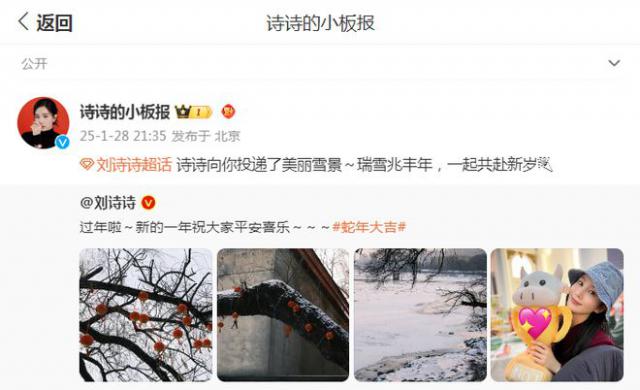 1 月 28 除夕那天,很多明星艺人也在个人社交平台上分享了自己的美照,以一种独特的方式庆祝我们的浪漫和团圆。刘诗诗还拍了一组漂亮的照片,并为此写道:“新年快到了。~新的一年祝大家事事顺心。~~~"。随后,诗歌的小板报(刘诗诗工作室)也分享了宣传:“诗歌为您提供了美丽的雪景。~瑞雪兆丰年,一起去新年”。