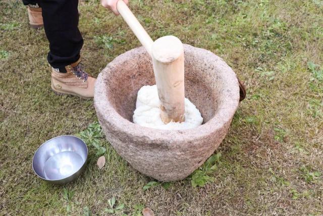 第三步:将蒸好的大米倒入石臼中,敲击翻饼,直至大米没有颗粒。