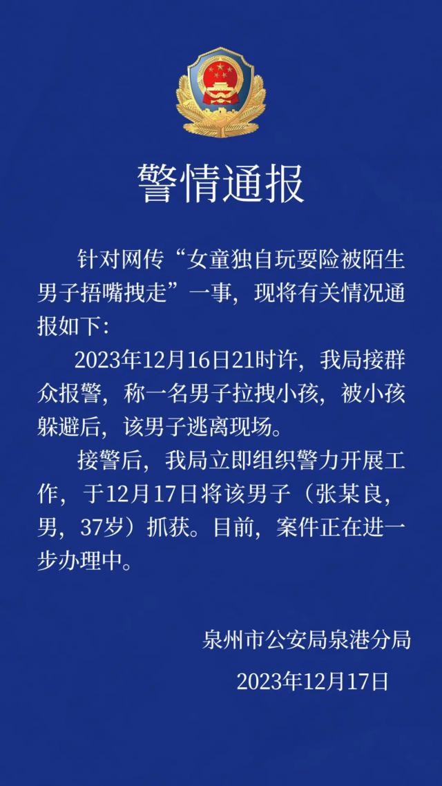 针对网爆“女孩独自玩耍险被陌生男子捂嘴拉走”一事,现将有关情况通报如下 :