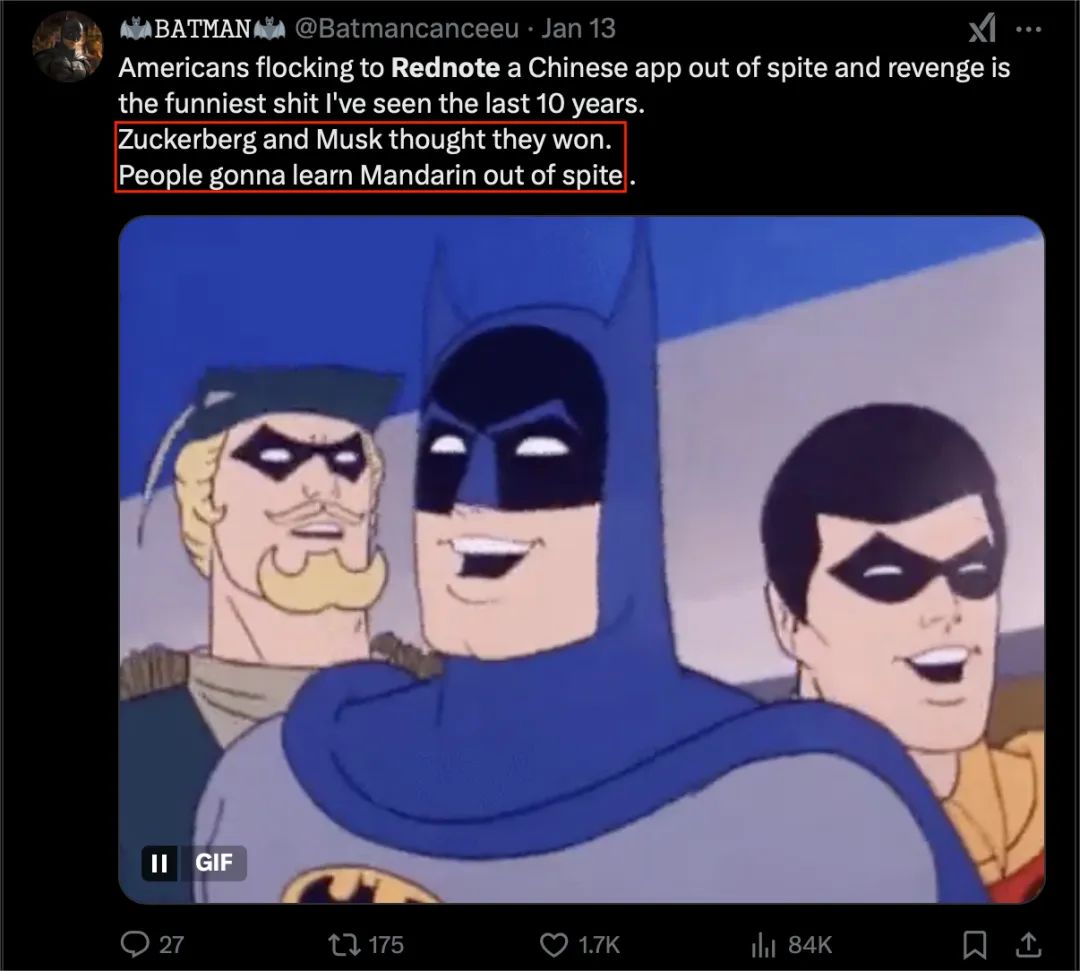 正如上面这个名字所说:Batman”美国网友在X上发布:“扎克伯格和马斯克认为他们赢了。但是每个人都会为了报复而学习普通话。”